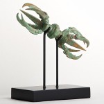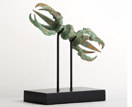 Description: Antique Shiva Weapon with Stand. This weapon is hand scuffed from antique bronze then fired. These weapons were the exclusive weapon of Shiwa, the HIndu god. Shiwa is the destroyer of the world, following Brahma the creator and Vishnu the preserver, after which Brahma again creates the world and so on. Shiva is responsible for change both in the form of death and destruction and in the positive sense of the shedding of old habits. In Satyam, Shivam, Sundaram or Truth, Goodness and Beauty, Shiva also represents the most essential goodness.