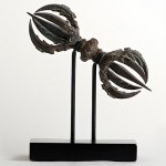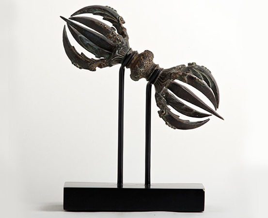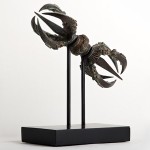Description: Antique Shiva Weapon with Stand. This weapon is hand scuffed from antique bronze then fired. These weapons were the exclusive weapon of Shiwa, the HIndu god. Shiwa is the destroyer of the world, following Brahma the creator and Vishnu the preserver, after which Brahma again creates the world and so on. Shiva is responsible for change both in the form of death and destruction and in the positive sense of the shedding of old habits. In Satyam, Shivam, Sundaram or Truth, Goodness and Beauty, Shiva also represents the most essential goodness.