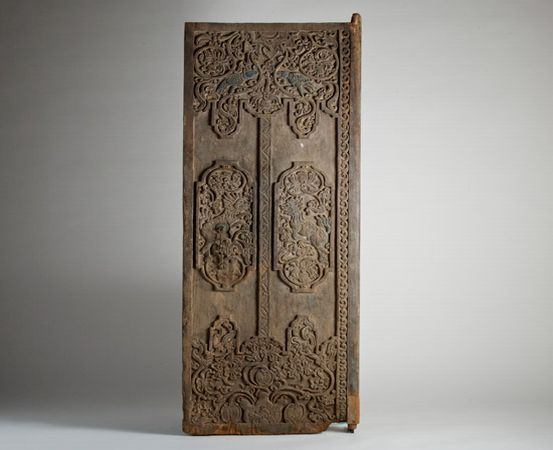 Description: Antique Ceremonial Door with Sacred Carvings: 22.5" L x 2" W x 63.5" H. The carvings on this beautiful and very archaic wooden door with wooden hinges show both Hindu-Buddhist and Islamic influences. The central square, which rises from the surface, on the door is akin to a coat of arms. This one is unusual because most such doors feature circular motifs derived from the Mandala images. (Mandala is Sanskrit for circle, polygon, community, connection. The Mandala is a symbol of man or woman in the world, a support for the meditating person).
