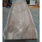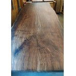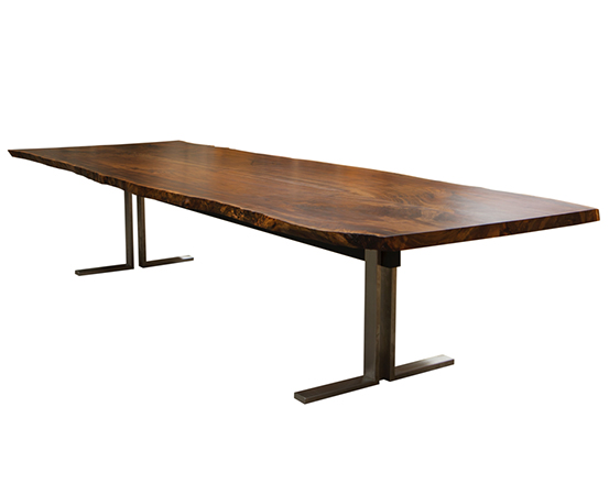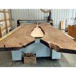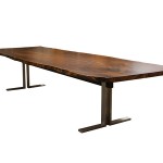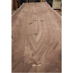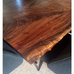 Description: Custom Dining table made from Claro Walnut wood with Live Edge detail. Base is brushed Stainless Steel. The slab was sliced in half, inverted and connected using Bowtie joints.