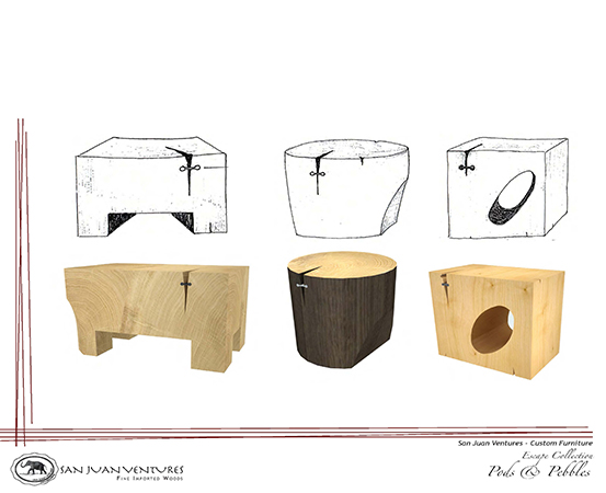 Description: The Escape Collection Pods & Pebbles Tables, all versions shown in Teak. All furniture is made according to individual project specifications. Sizes, designs, and materials can be modified in line with manufacturing recommendations.